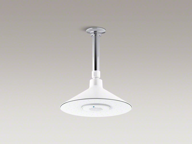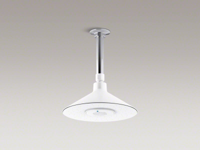 Rainhead with wireless speaker streams your personalized music playlists, news, and other audio in the shower.