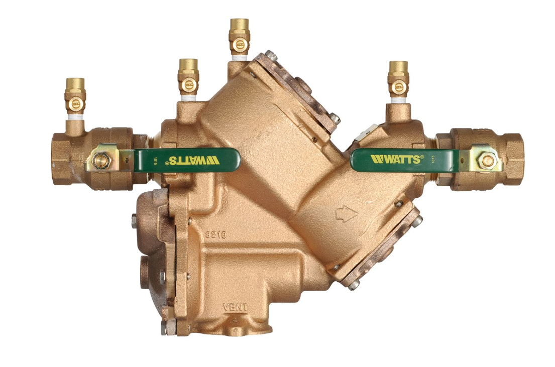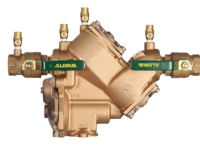 This 2 inch reduced pressure zone assembly with its exclusive design incorporating the patented air-in and water-out principle for protection during an emergency condition prevents the flow of polluted water from entering into the potable water supply due to backsiphonage and or backpressure in accordance with national plumbing codes and water authority requirements. Its compact modular design facilitates easy maintenance for in-line repairs. It can be installed horizontal or vertical without the need of any special tools. It is ideal for protection in continuous pressure piping applications and at cross-connections identified as health hazards and from other contaminants found at the service line entrance. This assembly consists of a lead free bronze body, quarter turn ball valve shutoffs with lever handles, check modules, replaceable seats, top mounted test cocks, and a pressure differential relief valve.