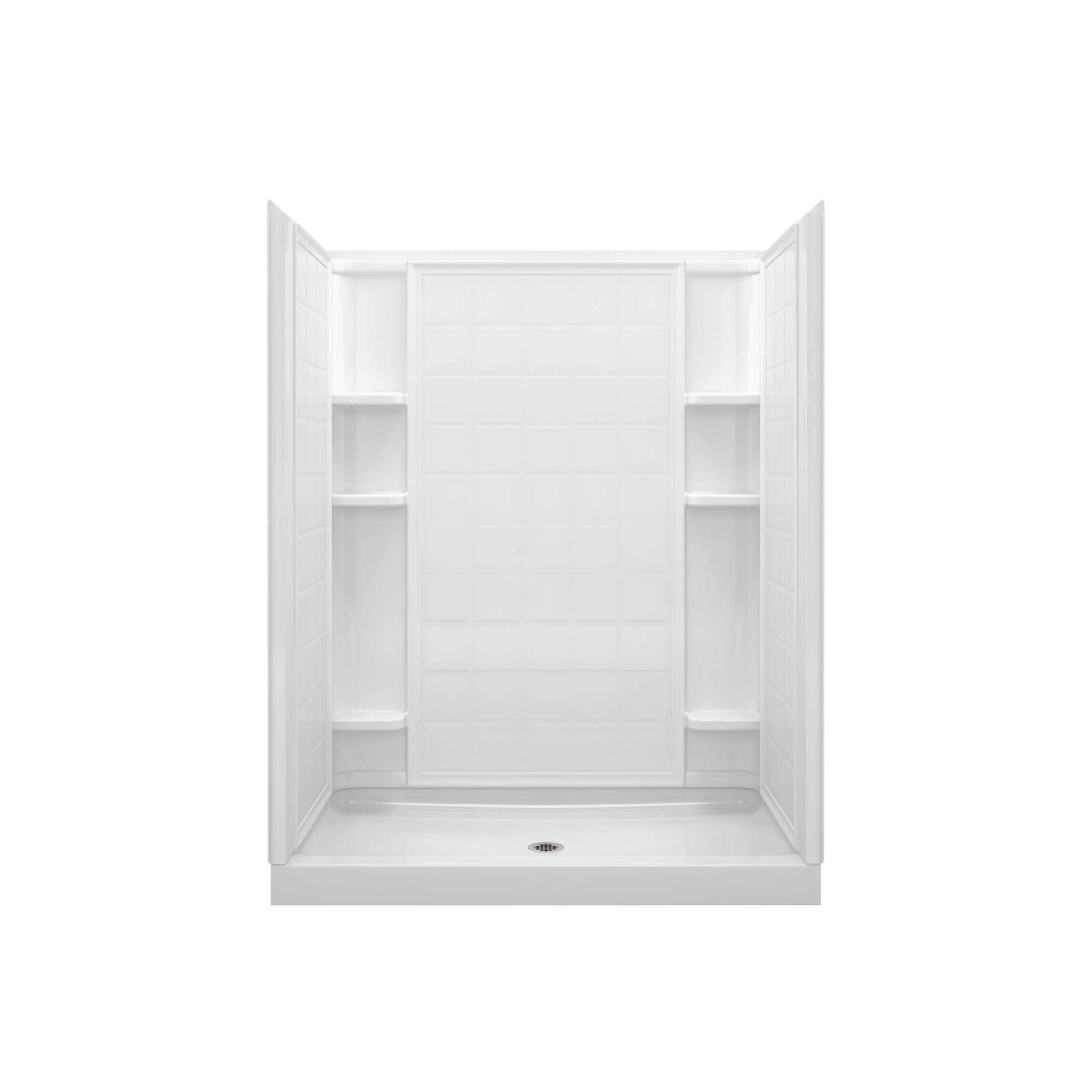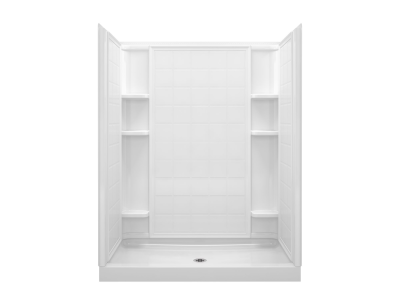 60" shower, made of solid Vikrell(R) material, Modular four-piece design moves around corners and through doorways with ease, Tongue-and-groove interlocking joints form a seamless appearance and simplify installation, Realistic 6" x 6" tile wall surround, Durable high-gloss finish provides a smooth, shiny surface. Convenient shelves provide generous storage, Shaving ledge/foot rest added for comfort, 10-year consumer/3-year commercial limited warranty