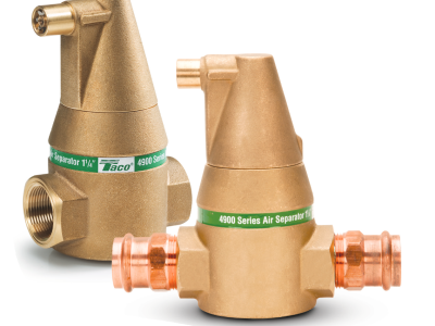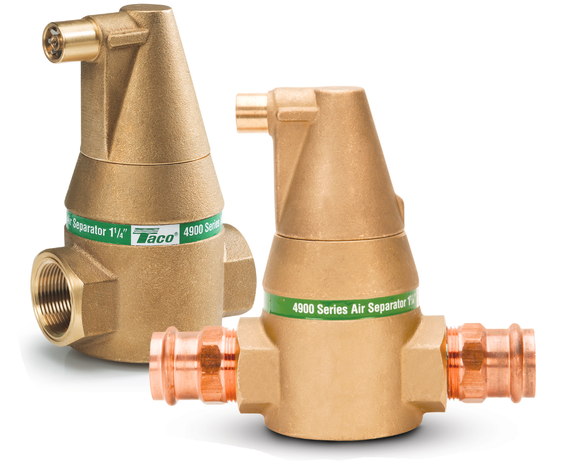 The Taco 4900 Series Air Separators are designed for the complete elimination of air from closed loop heating and cooling systems up to a maximum temperature of 240 F and a maximum pressure of 150 psi. The principle on which the Taco 4900 Series Air Separator is based is a patented and proven method of removing gases from water: the PALL ring process. Minimal pressure loss - Vent can be closed - Large surface contact area - Protective vent plate - Maximum air removal - Expansion tank connection tapping - No minimum run of pipe requirement - Bi-directional flow