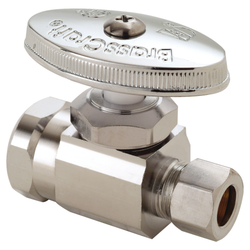 BrassCraft® Straight Stop, Multi-Turn, Series: OR12X, 1/2 x 3/8 in Nominal, FNPT x Compression End Style, 125 psi Pressure, Media: Water, Brass Body, Brass/POM Trim, Rubber Bib, Packing Washer Softgoods, 40 to 140 deg F, 1.63 x 2.07 in Dimension, Polished Chrome, Domestic