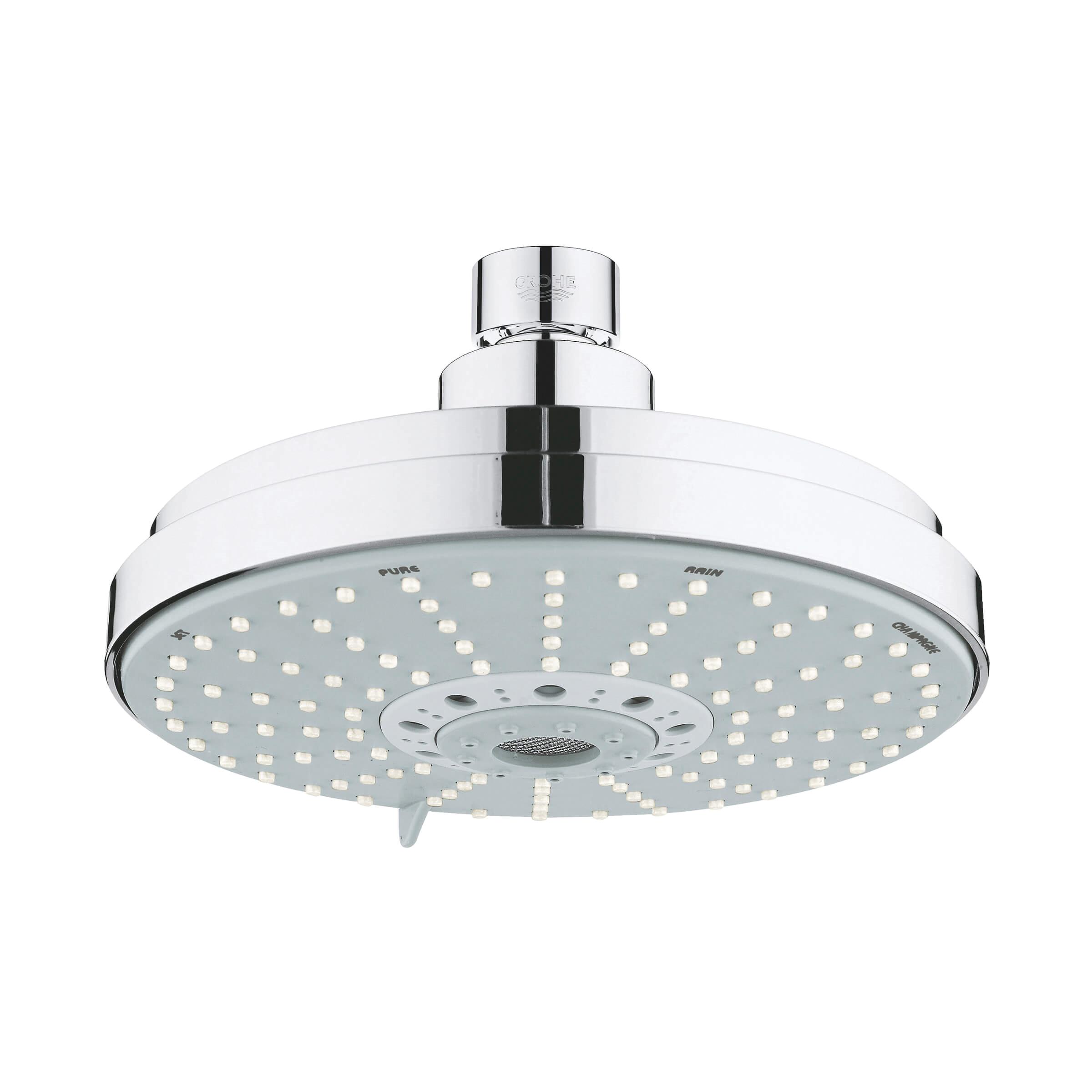 GROHE Shower Head, Rainshower® Cosmopolitan 160 Collection, 2.5 gpm Flow Rate, 1/2 in Connection, Round Shape, 4 Sprays, Spray Pattern: Rain/Jet/Pure/Champagne, Ceiling Mounting, 0.5 bar Pressure, 6-3/8 in Dia Head, 3-7/8 in Overall Height, ABS, Polished Chrome, Import