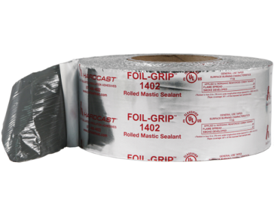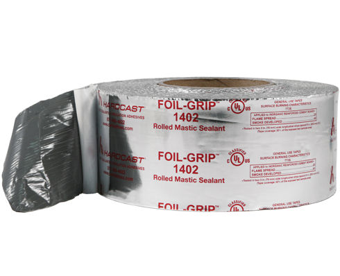 Foil-Grip 1402 is a pressure sensitive, 40-year cycle, duct joint and general purpose rolled sealant. It provides an instant water resistant grip to most surfaces including sheet metal, duct board, flex board, PVC coated duct, and duct wrap vapor barriers. Foil-Grip 1402 is suitable for sub-grade application on PVC coated duct.