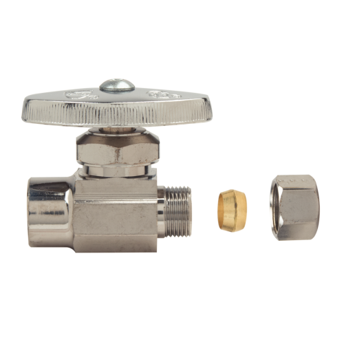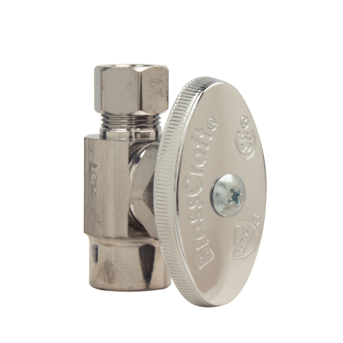 BrassCraft® Straight Stop, Multi-Turn, 1/2 x 3/8 in Nominal, C x Compression End Style, 125 psi Pressure, Media: Water, Brass Body, Brass Trim, Rubber Bib, Packing Washer Softgoods, 40 to 140 deg F, Polished Chrome, Domestic