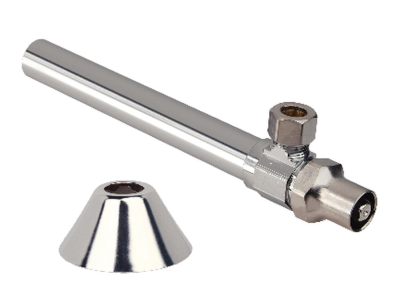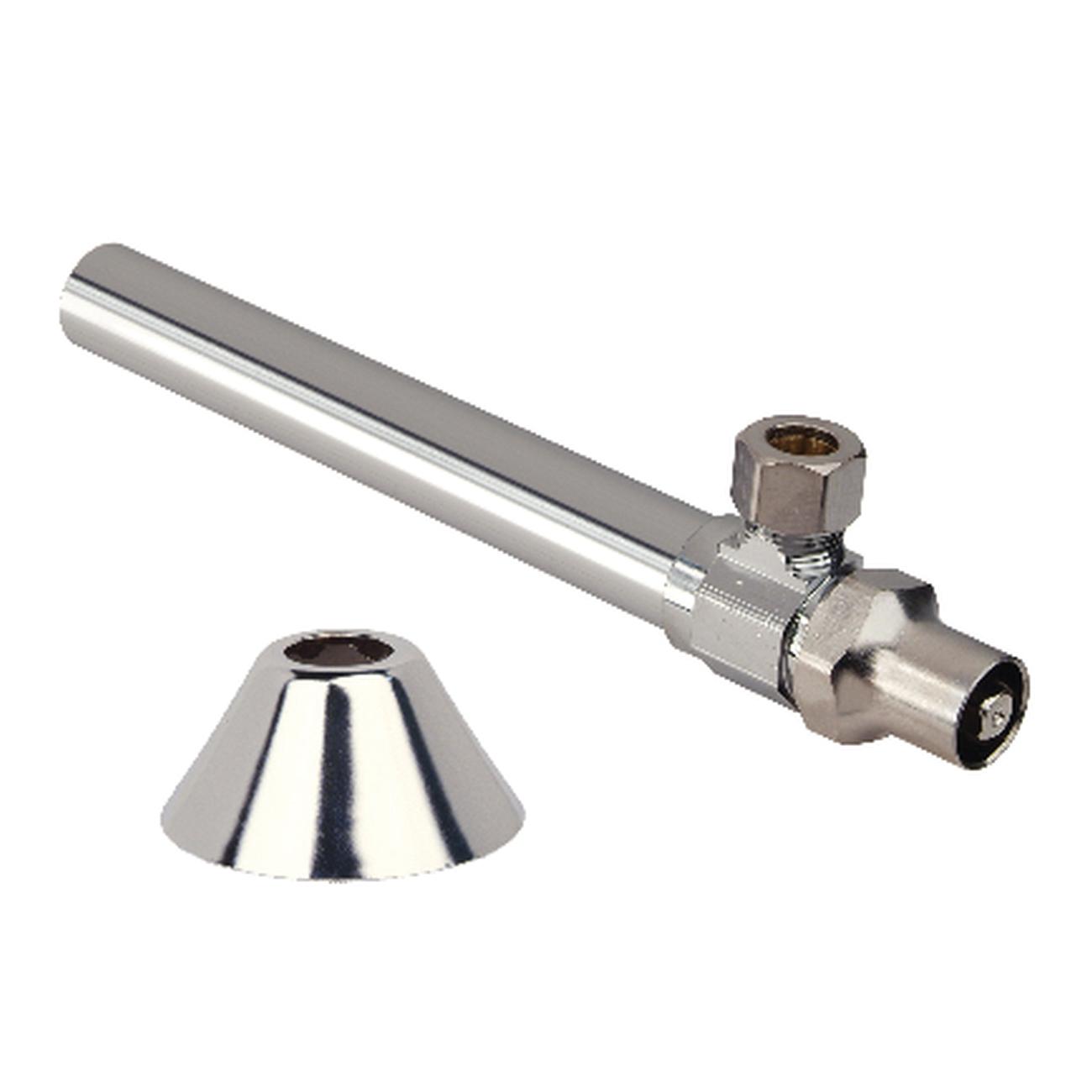 BrassCraft® 1/2 in Nominal C Inlet x 3/8 in OD Compression Outlet Multi-Turn Angle Valve With Lockshield, Loose Key, 5 in Extension and Bell Escutcheon controls water flow to household plumbing fixtures - faucets, toilets, dishwashers, icemakers, washing machines and more. The angle valve is most often used where the water pipe enters the room from the wall. With a few turns of the key, you are able to stop or start the flow of water leading to the plumbing fixture, allowing for maintenance and repair without shutting off the water to the entire home.