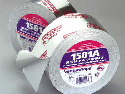 3M(TM) Venture Tape(TM) UL181A-P Aluminum Foil Tape 1581A is a 2.0 mil high temperature, high strength aluminum foil coated with a cold weather acrylic pressure sensitive adhesive. Conformable foil applies easily to both fibrous and sheet metal ducts on flat and irregular surfaces.