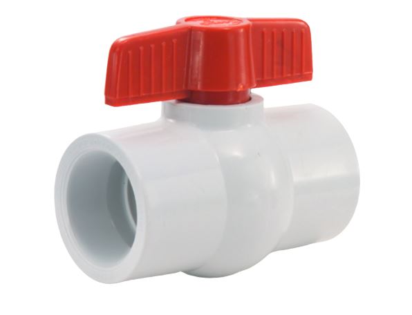 PVC compact ball valves are constructed of ASTM D1784 virgin PVC resin. Their large ports allow maximum flow and minimum pressure drop or turbulance. Severe shock loads and stress are absorbed by the valve body, not the ball and seats, thereby minimizing the chance of uneven wear and leakage. May be installed on schedule 40 or 80 PVC pipe. All sizes are NSF 61-9 certified for use in potable water systems.
