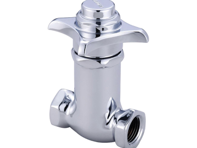 The self closing straight stop has a cast brass body with a replaceable seat. The faucet has a cam operated self closing stem that is lifted off the seat when the handle is rotated. The replaceable seat, stem, centerpiece, and four arm handle are all brass. The vandal resistant handle ("V" suffix) has a set screw to hold down the cap from being removed. The return spring is stainless steel. The packing is a reinforced rubber compound. The cam action roller bearings are brass. The straight stop has a polished chrome plated finish.