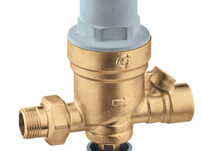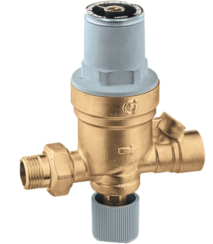 Brass body - 1/2 inch male union inlet - 1/2 inch female outlet - 230 PSI maximum inlet pressure - 150 degree maximum working temperature - 15 PSI preset outlet pressure - Pre-adjustable - Anti-scale with visual system pressure setting indicator - Complete with manual shut-off valve, strainer and check valve