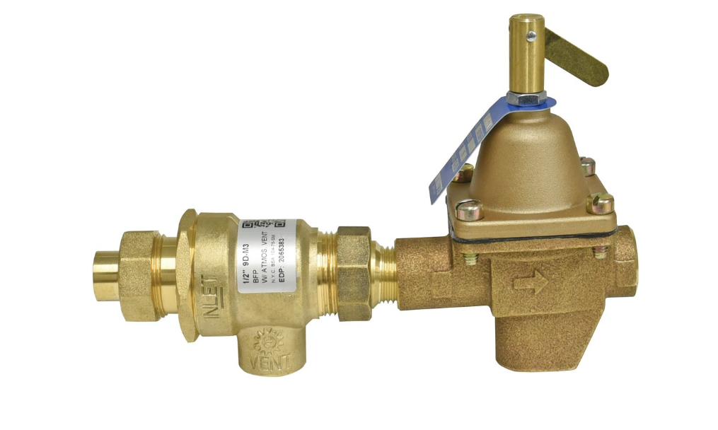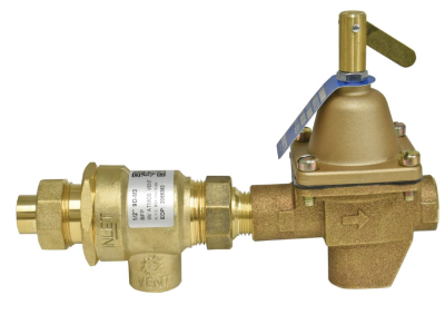 This 1/2 inch bronze combination fill valve and backflow preventer is for use in commercial and residential hydronic heating systems to provide make-up water to the boiler, and prevent backflow when supply pressure falls below system pressure. It consists of a bronze backflow preventer, model 9D and a bronze feed water pressure regulator, model 1156F, in one pre-assembled unit. The high capacity fill valve provides quick system filling and purging. It is designed for use in the boiler feed lines of hydronic heating systems and has 1/2 inch union NPT inlet x NPT theaded outlet connections. The maximum pressure is 100 psi