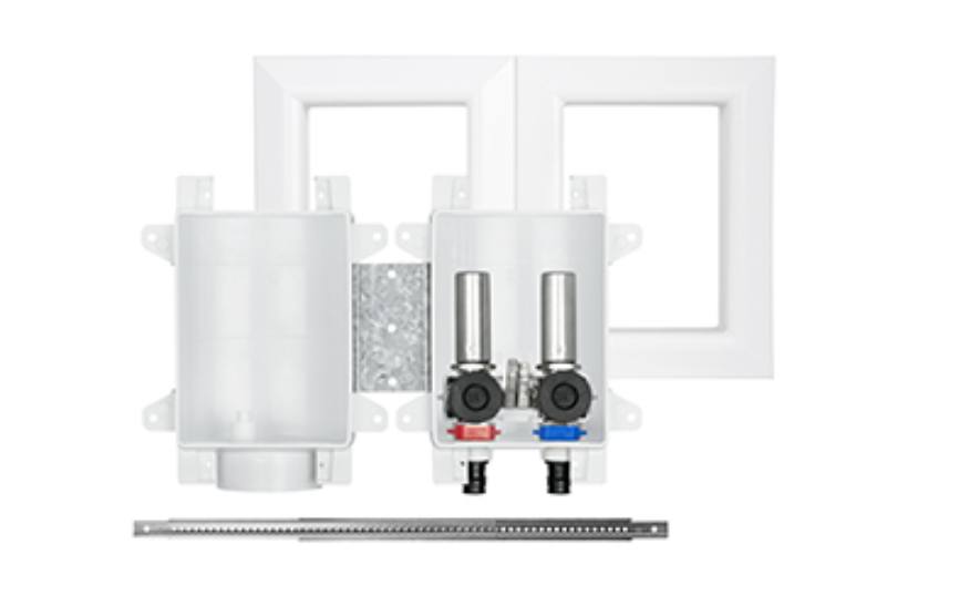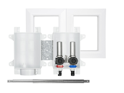 Two boxes separate supply and drain into 2 stud bays - Boxes mount securely to stud or over stud - Easy to remove drain knockout - Includes 2 MiniRester water hammer arresters - Debris cover protects valves - Quarter turn ball valves with hose connections