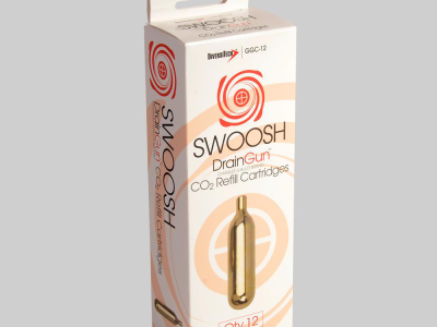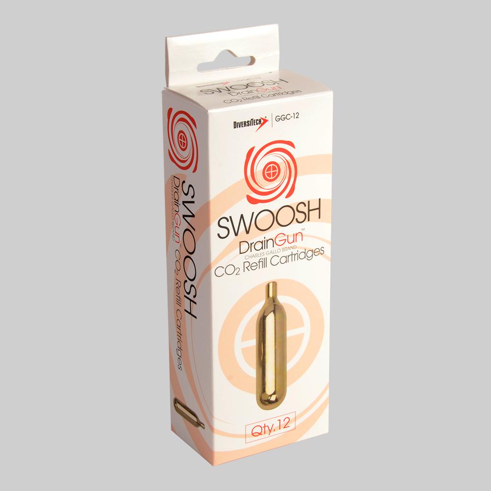 The GGC-12 SWOOSH® Drain Gun® CO2 cartridge in 12 piece pack. Clearing condensate drains with this CO2 cartridges deliver 800 PSI of oil free air. Cartridges are environmentally safe and recyclable. No need for air or nitrogen tanks. Reduces labor costs and time on service calls.