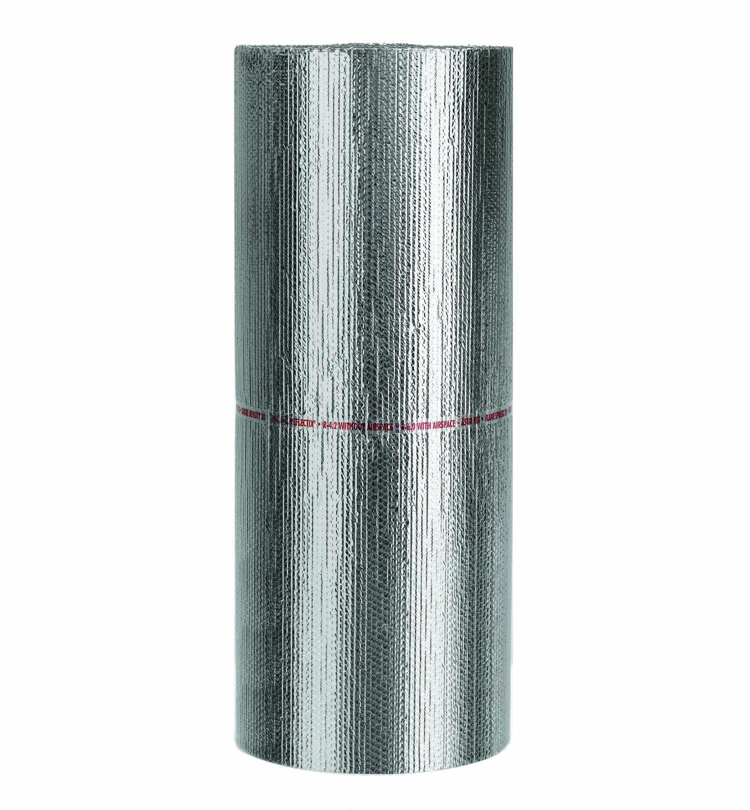 Reflectix® Duct Insulation consists of two layers of highly reflective film (94%+ reflectivity) that are bonded to two tough layers of polyethylene. Two inner layers of insulating bubbles resist conductive heat flow while a center layer of polyethylene gives Reflectix® high reliability and strength. The product has a tape running the length of the roll for easy identification by code officials.