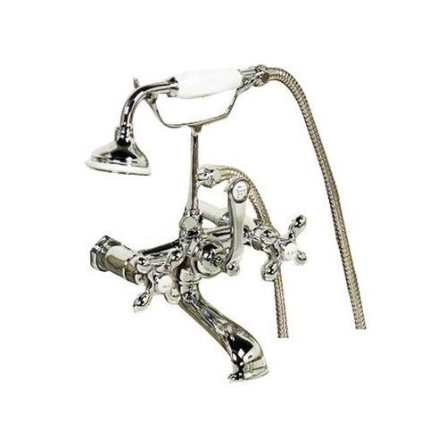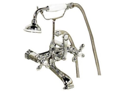 This stylish tub wall-mounted faucet has a telephone style hand held shower, a wide elephant spout and decorative metal cross handles.