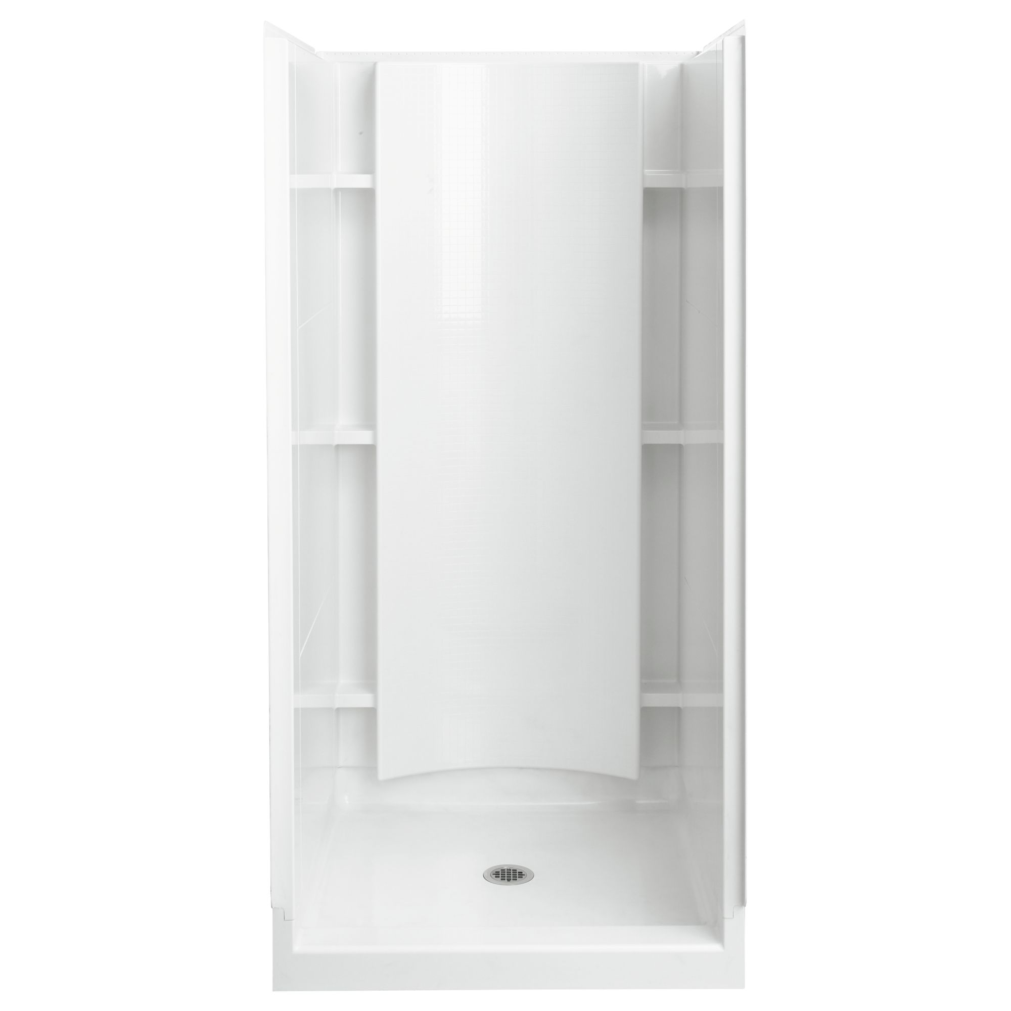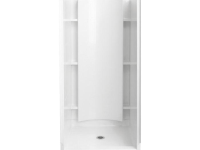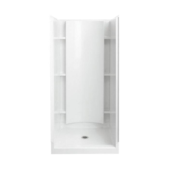 Sterling® Shower, 4-Piece, Series: 72240100, Accord®, 36-1/4 in Length, 37-1/4 in Width, 77 in Height, 3 Wall Panels, 6 Built-In Shelves, Center Drain, Alcove Mount, Solid Vikrell®, White