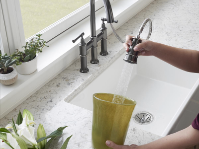 Elkay® Kitchen Faucet, Explore™, 1.5 gpm, 4 in Center Distance, Pull-Down Spray Spout, 9-1/4 in Spout Reach, 17-1/8 in Spout Height, Lever Handle, 2 Handles, 3 Faucet Holes, 1-3/8 in Faucet Hole, 1/2-14, NPSM, Spray Pattern: Pull-Down/Aerated/Pause, Function: Traditional, 8-5/8 in Maximum Deck Thickness, Deck Mount, Ceramic Disc Valve/Cartridge, Brass, Antique Steel, Import