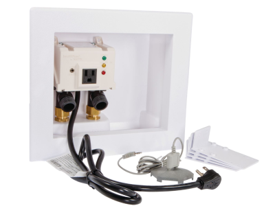 This IntelliFlow automatic washing machine shutoff valve with leak sensor is used in residential applications to protect against catastrophic water damage from a burst inlet hose connected to a washing machine in use or unattended. It senses when the washing machine is on or off, and then opens or closes the hot and cold inlet valves as needed to allow or prevent water from flowing to the washer. If it detects a leak, current flow to both the hot and cold water valves are immediately interrupted and closed. This device consists of an electrical three-prong outlet to receive a washing machine power cable, leak sensor, power cord, and a replaceable internal strainer screen. It also comes equipped with 1/2 inch sweat inlet adapters for both hot and cold water supply tubing, a wall mounting box, and two mounting tabs used to secure the valve to the wall for surface mount applications. The maximum pressure is 150 psi.