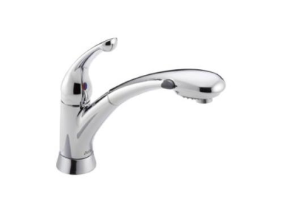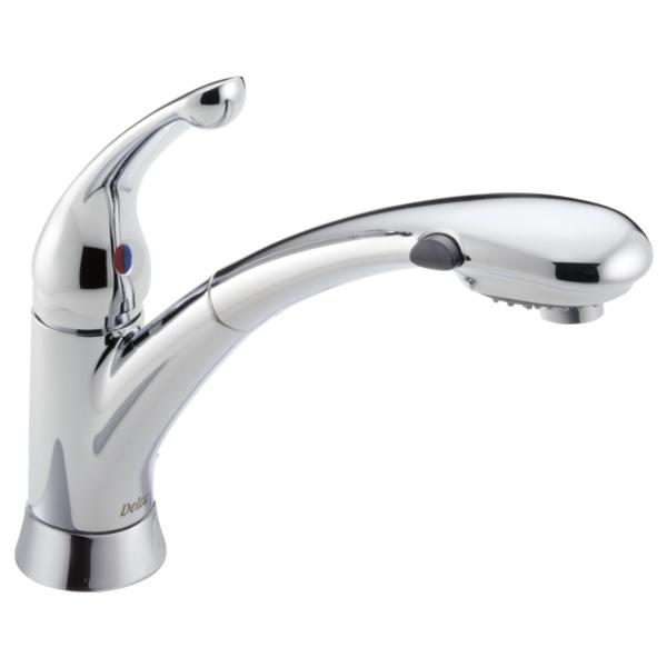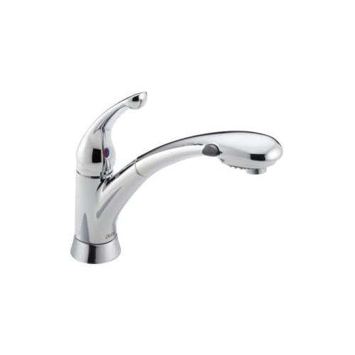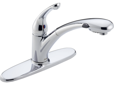 DELTA® Kitchen Faucet, Signature™ Collection, 1.8 gpm Flow Rate, 8 in Center Distance, 120 deg Swivel Spout, 9 in Spout Reach, 10 in Spout Height, 59 in Hose, Lever Handle, 1 Handles, Side Spray(Y/N): No, 1/3 Faucet Holes, 3/8 in Connection, Compression Connection, Spray Pattern: Aerated Stream/Full Body, 2 Spray Functions, 2-1/2 in Maximum Deck Thickness, Deck Mounting, Euro-Motion DIAMOND™ Seal Valve, Zinc, Polished Chrome
