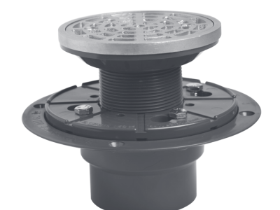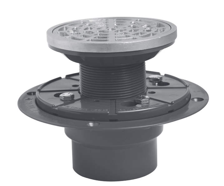 4-7/16 inch diameter top - Machine screws and threaded brass inserts in drain body and head adapter - Beveled drain body with mounting holes - Height is adjustable from 3-15/16 inches to 5-15/16 inches