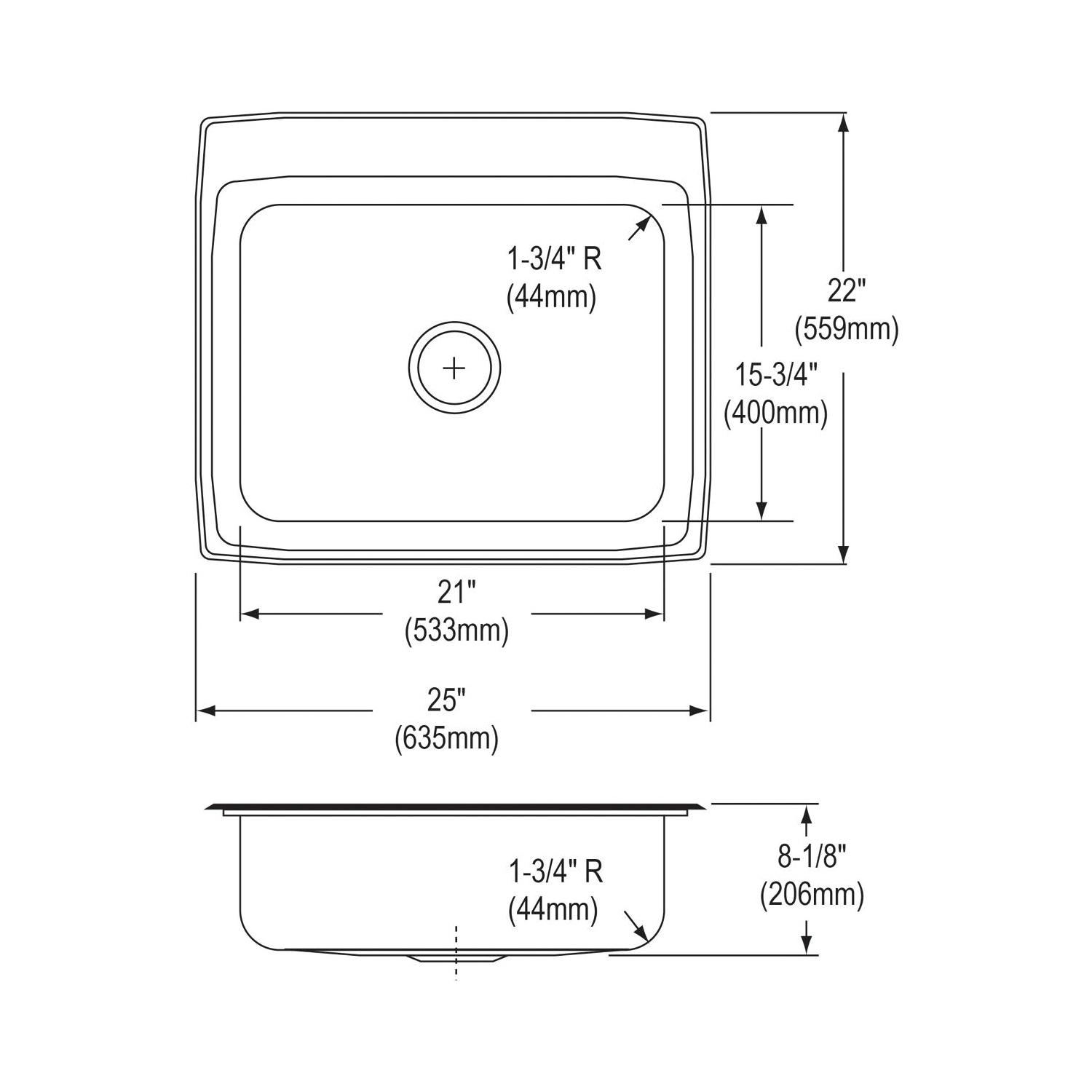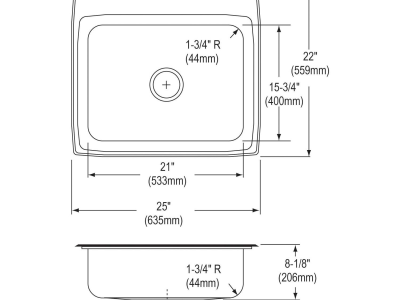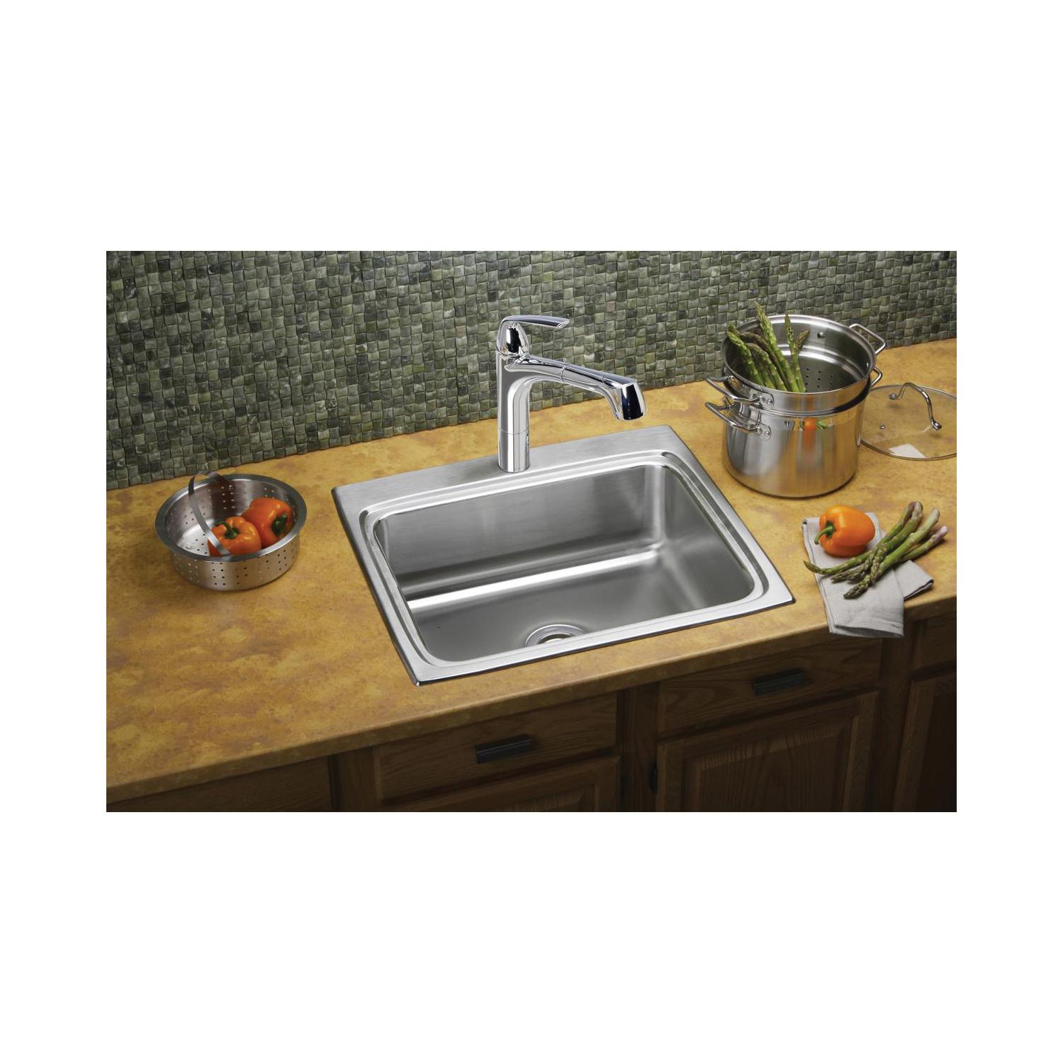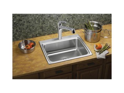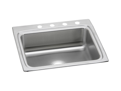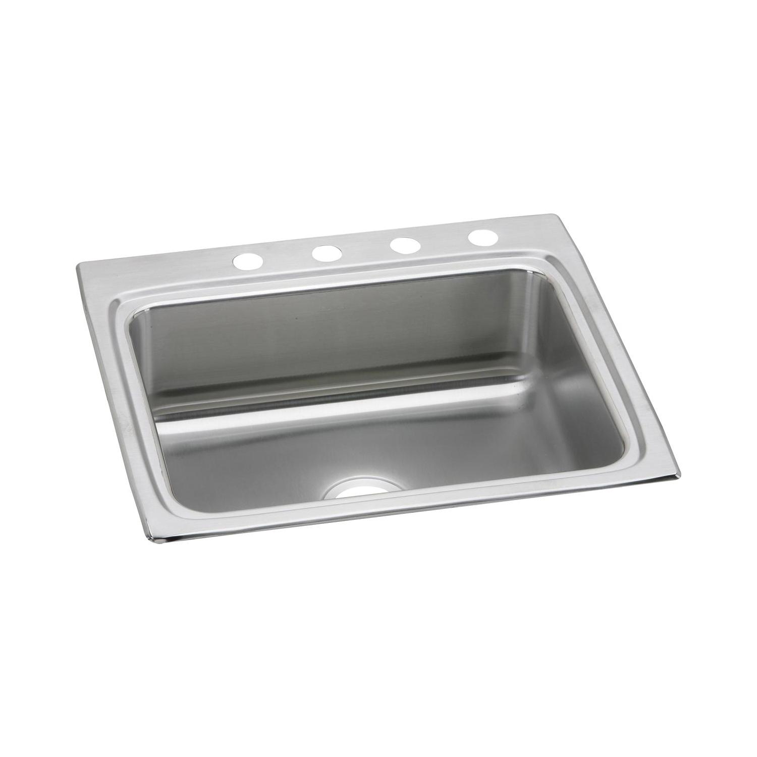 Elkay®, LR25224, Kitchen Sink, Lustertone™ Classic Collection, Rectangle Shape, 21 in Bowl Length, 15-3/4 in Bowl Width, 7-3/4 in Bowl Depth, 3-1/2 in Drain Opening, 4 Faucet Holes, 4 in Faucet Hole Spacing, 1 Bowls, 25 in L x 22 in W x 8-1/8 in H Overall, Drop-In Mounting, Stainless Steel, Domestic