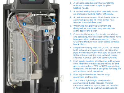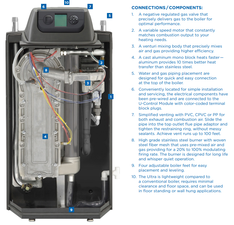 Weil McLain takes condensing boiler technology to a higher level of performance. The Ultra Series 4 features a state of the art heat exchanger with nanotechnology coating that works like "Ultra Armor", reducing build up in the heat exchanger while maintaining high efficiency. Nanotechnology is a heat exchanger coating that combines anti-adhesive and anti-corrosion properties, which protects the heat exchanger from corrosion and combustion residue build up. In conventional systems, aggressive exhaust particles can attach to the surface and cause heat exchangers to corrode. Heat transfer is then reduced and the heating system's energy efficiency decreases. With nanotechnology properties, biofilm formation is inhibited and allows residues to be easily carried out of the heat exchanger before they obstruct the flueways. In addition, Ultra Series 4 has an advanced condensate management system that incorporates polypropylene piping to further reduce the impact of condensate. Thanks to our nano-coated heat exchanger, the Ultra Series 4 requires no cleaning for a full five years after installation. When it's time to clean, a simple rinsing of the coated heat exchanger with water does the trick. The Ultra Series 4 is an ideal choice for single family residential applications. Homeowners will appreciate its quiet operation, ease of set up and control, and unmatched comfort while providing immediate payback in energy savings. For light commercial applications, the Ultra Series 4 lets contractors pair boilers in sequence to heat larger buildings. And, it allows you to control multiple boilers from a single control panel. Back-lit LCD display and simple programming buttons make entering and receiving information easy. The homeowner has the ability to view current boiler status, check water and outdoor temperatures, review boiler maintenance schedule and view installing contractor contact information.