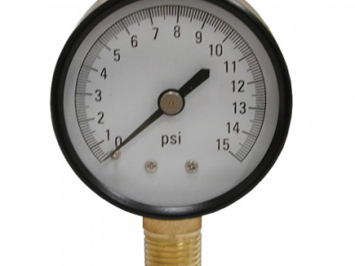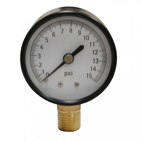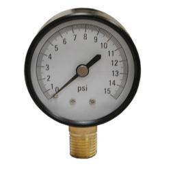 Jones Stephens™ Pressure Gauge, 0 to 15 psi, 1/4 in MNPT, 2-1/2 in Dial Diameter, 2.5-2 % Accuracy, Lower Mount, Steel Case, 3-1/4 in H