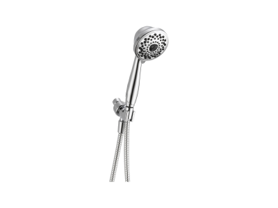 DELTA® Shower Mount Hand Shower, Premium, 3-13/16 in Shower Head Diameter, 7-Function Shower Head Patterns, 2 gpm Flow Rate, 60 in Hose Length, Drench/Fast Massage/Full Body/Full Body with Massage/Pause/Shampoo Rinsing/Soft Drench with Full Body Spray, 80 psi Pressure, Metal Hose, Polished Chrome, Import