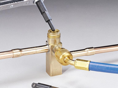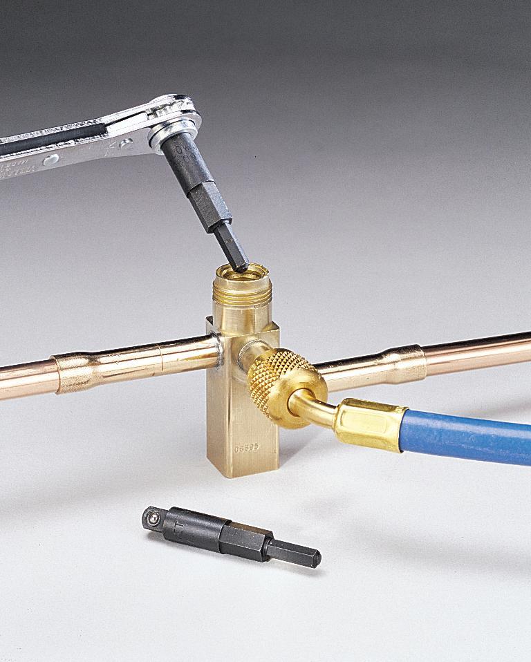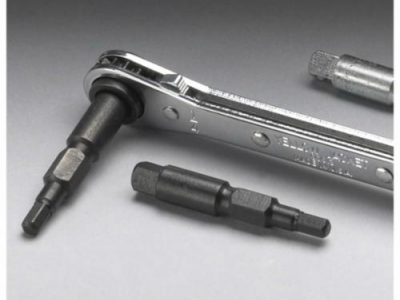 Combination service wrench and hex adapter (60610) for accessing liquid & suction based valves on residential & commercial units up to 7.5 tons. Heat-treated hex works for 3/16 in and 5/16 in hex valves. Black oxide plated.