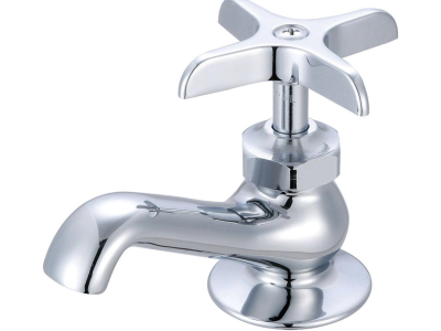 The lavatory faucet has a solid cast brass body with a replaceable seat. The stem is brass with a replaceable rubber seat washer. The replaceable seat is chrome plated brass. The cross handle is zinc with a chrome plated finish and is indexed with a C (cold), H (hot) or is plain with no indexed marking. The faucet packing is a reinforced rubber. The body and packing nut are polished and chrome plated.
