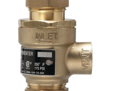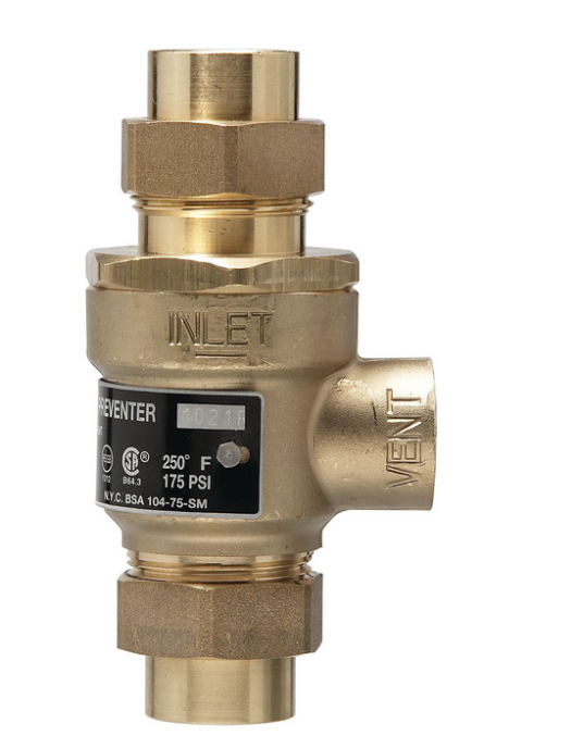 Can be installed vertcally or horizontally. This 1/2 inch dual check valve with atmospheric vent prevents the reverse flow of hot or cold polluted water from entering into the potable water supply. This valve is designed for continuous pressure non-health hazard applications in smaller supply lines, such as laboratory equipment, processing tanks, sterilizers, dairy equipment, and specifically for boiler feed lines. It consists of a brass body with stainless steel internal parts, integral strainer, two durable tight seating rubber check valves, and NPT female inlet and outlet connections.
