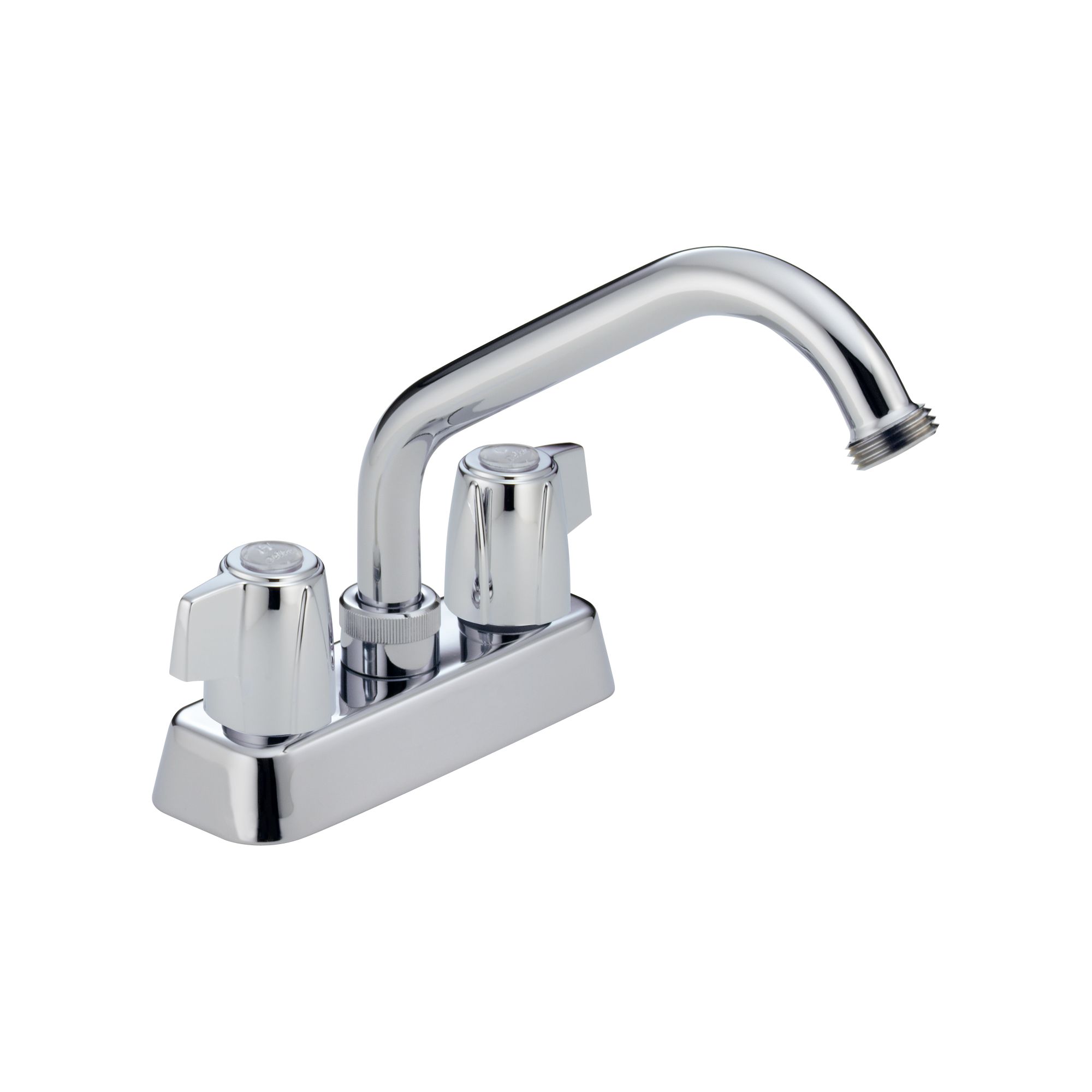 DELTA® Laundry Faucet, Classic™, 4 in Center Distance, 360 deg Swing Spout, 7 in Spout Reach, 2-3/8 in Spout Height, Blade, 2 Handles, 2 or 3 Faucet Holes, 1/2 in, IPS, 1 in Maximum Deck Thickness, Deck Mount, Washerless Stem Valve/Cartridge, 6-1/2 in W x 4-5/8 in H, Solid Brass, Polished Chrome, Import