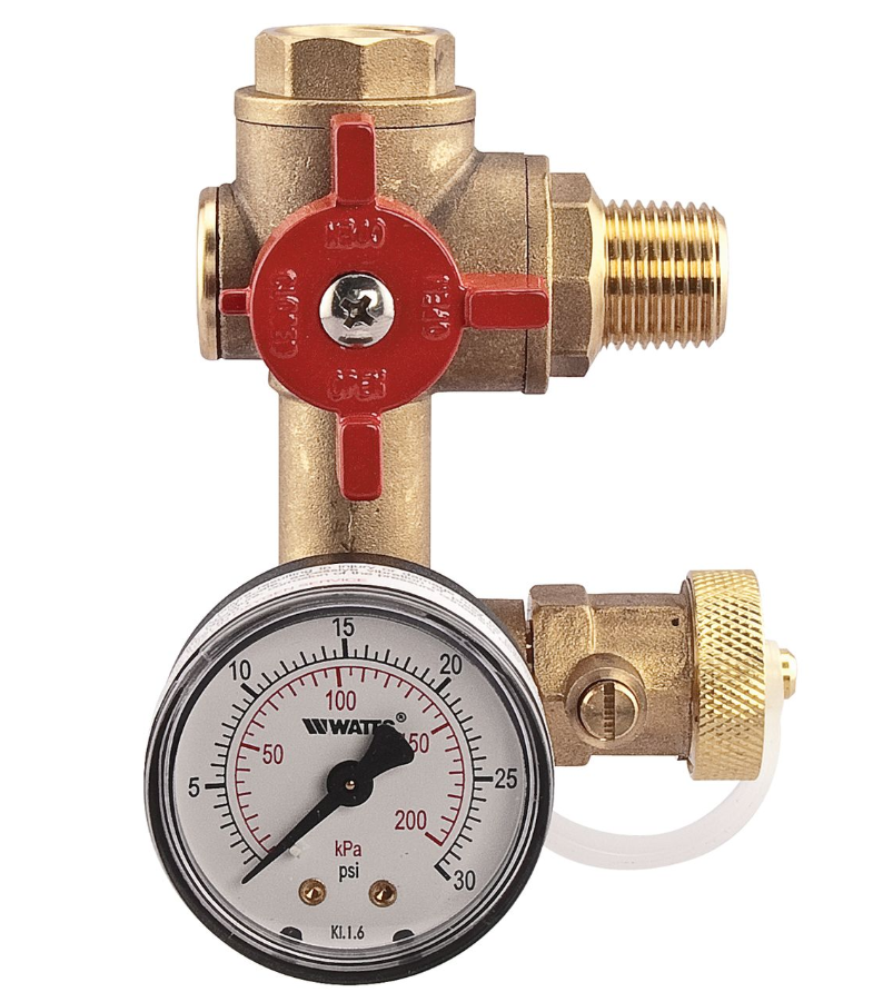 This residential boiler fill fitting provides a convenient solution to comply with boiler manufacturers' piping requirements. It provides ease of service for expansion tanks and water pressure regulator valves in closed-loop hot water heating systems. Using a unique 3-way ball valve design, it eliminates up to twelve 1/2 inch fittings in a compact package while the one-piece construction eliminates up to eleven threaded joints. It features a unique 3-way ball valve for isolation of water pressure regulator and expansion tank from system pressure. For air charge servicing and maintenance it also has a drain port with integral ball valve for unloading pressure from waterside of expansion tank diaphragm, and a zero to thirty psi pressure gauge for convenient system pressure reference