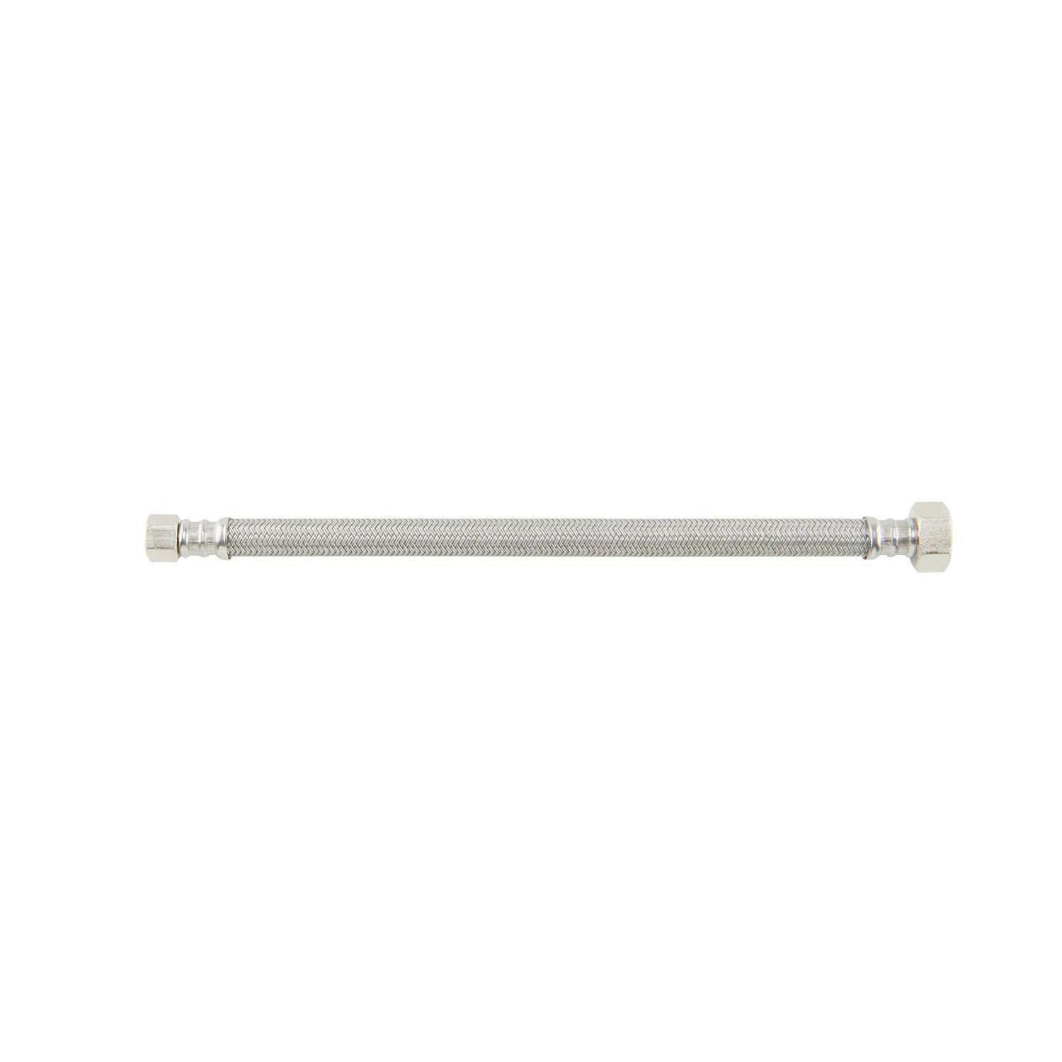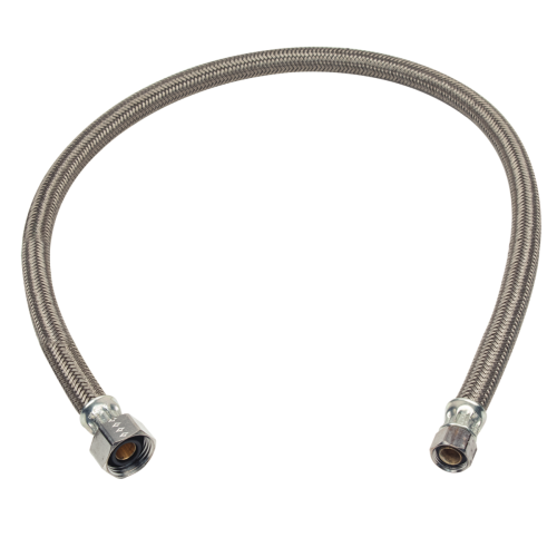 BrassCraft® Speedi Plumb® PLUS 3/8 in Compression inlet x 1/2 in Female Iron Pipe outlet flexible braided polymer water connector is corrosion resistant inside and out. Used to connect the water supply to your faucet, this connector features a high tenacity, multi-filament yarn, protected by a special polymer coating for optimum corrosion resistance and durability. On the inside, our tough PVC tubing resists attack by chlorine, chloramines and other corrosive elements. The braided polymer fibers are designed to bend freely without kinking or crimping.