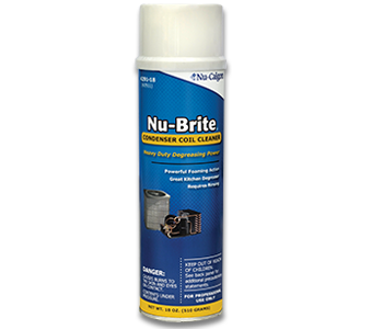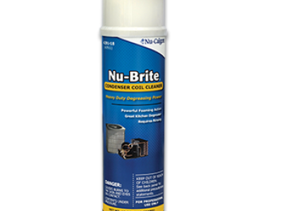 Aerosol Nu-Brite is the newest member of the family of Nu-Brite packages. It is a non-acid, alkaline-based product for cleaning and brightening air cooled condensers. It provides effective degreasing and cleaning of coils, particularly those fouled with cooking greases. Nu-Brite is formulated with the best available foaming detergents and chelants to quickly penetrate and dissolve greasy dirt and grime and foam it right out of the coil.
