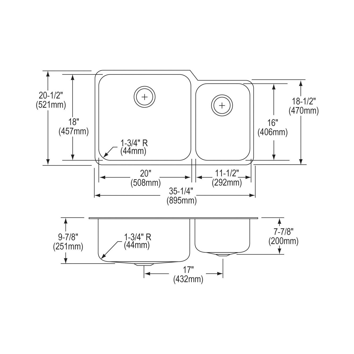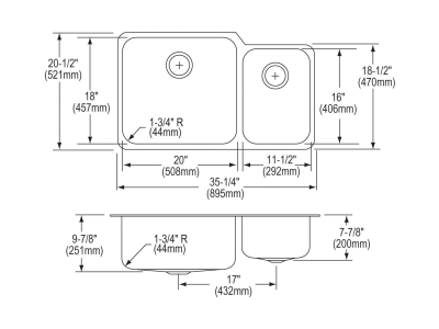 Elkay®, ELUH3520R, Kitchen Sink, Offset, Lustertone™ Classic Collection, Rectangle Shape, 20 in Left, 11-1/2 in Right Bowl Length, 18 in Left, 16 in Right Bowl Width, 9-7/8 in Left, 7-7/8 in Right Bowl Depth, 3-1/2 in Drain Opening, 2 Bowls, 35-1/4 in L x 20-1/2 in W x 9-7/8 in H Overall, Undermount Mounting, 18 ga 304 Stainless Steel, Domestic