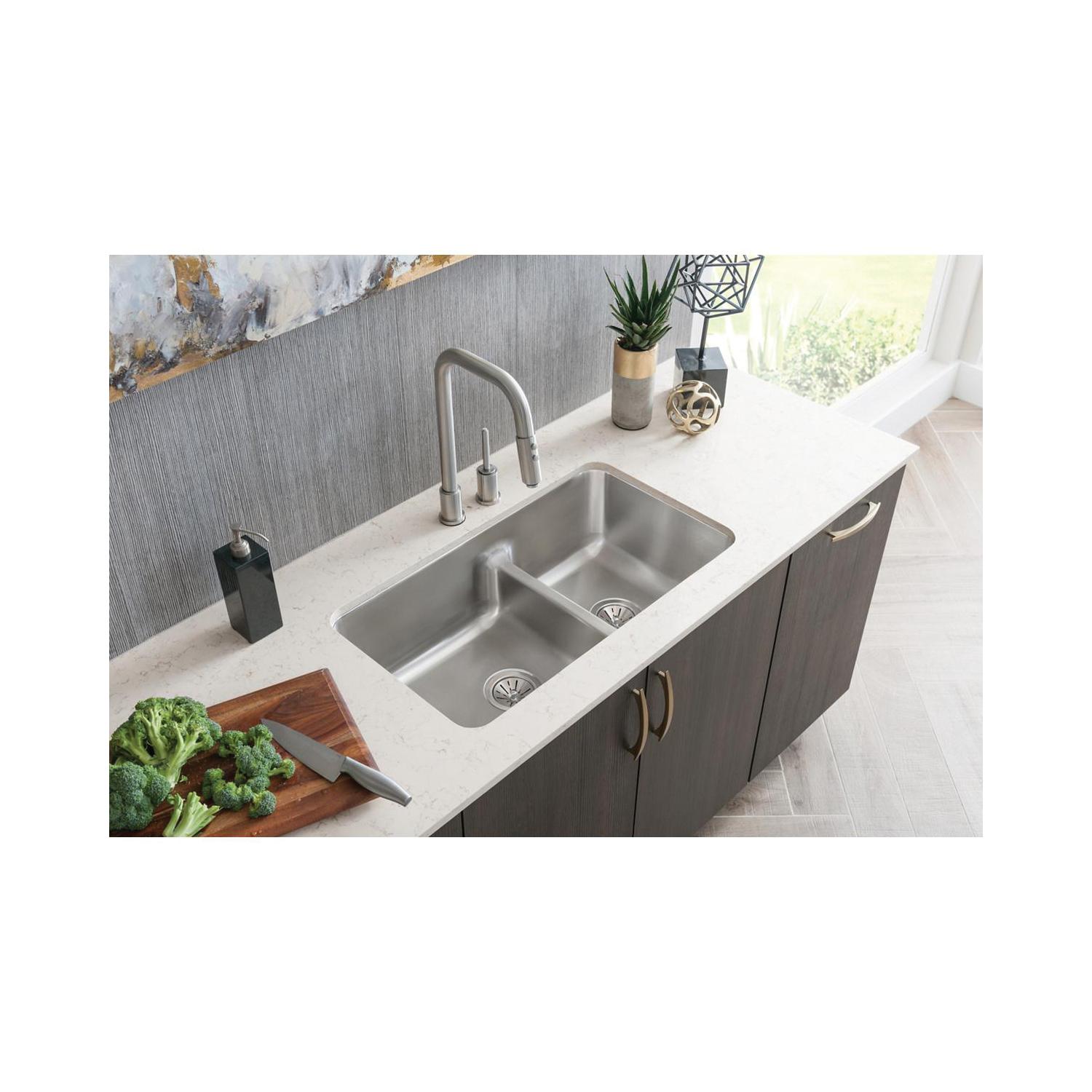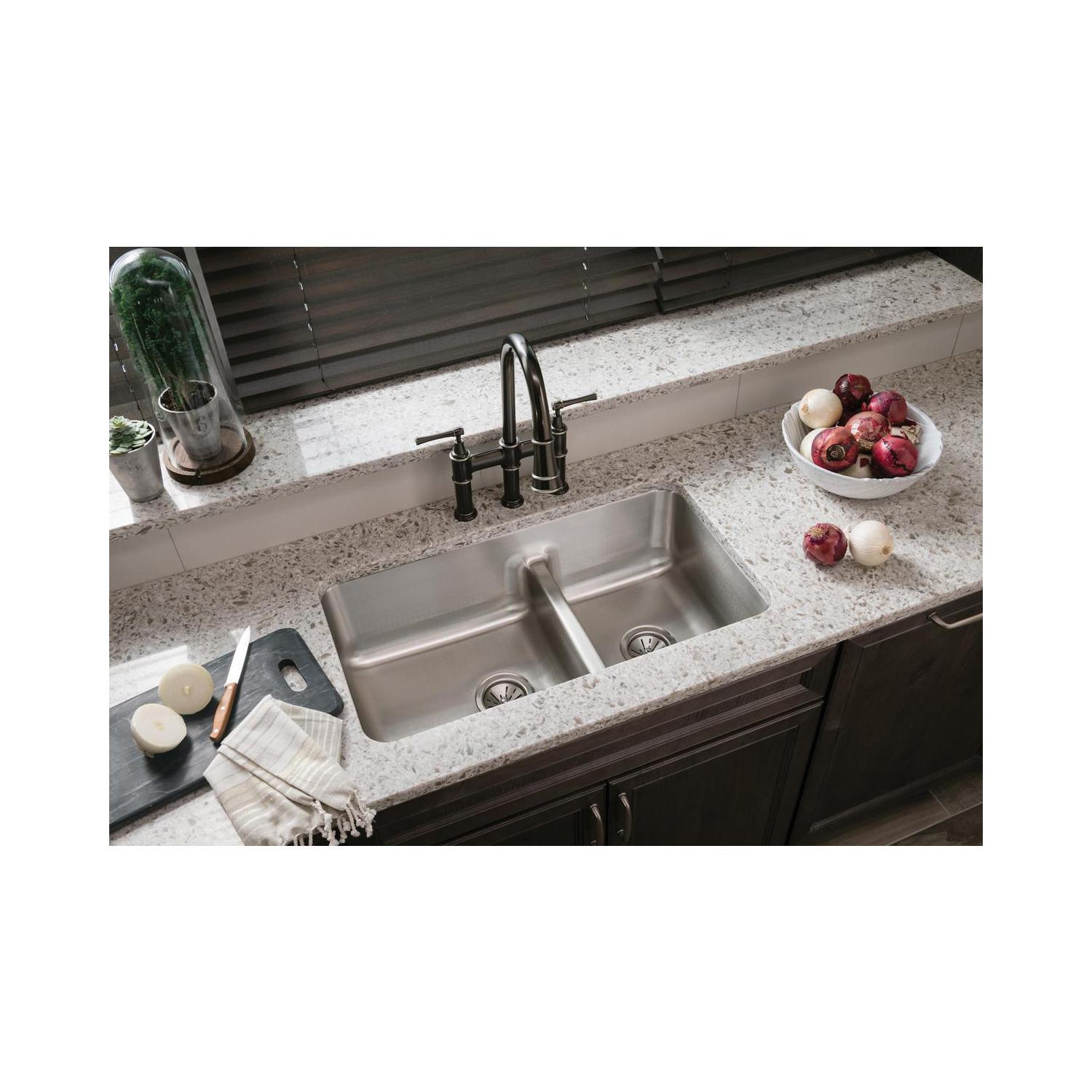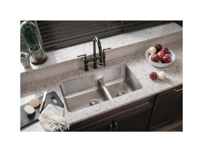 Elkay® ELUHAQD32179 Lustertone™ Classic Kitchen Sink, Rectangle Shape, 12-3/16 in Left, 16-1/2 in Right L x 16-1/2 in Left, 16-1/2 in Right W Bowl x 9 in Left, 9 in Right D Bowl, 32-1/16 in L x 18-1/2 in W x 9 in H, Undermount Mounting