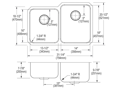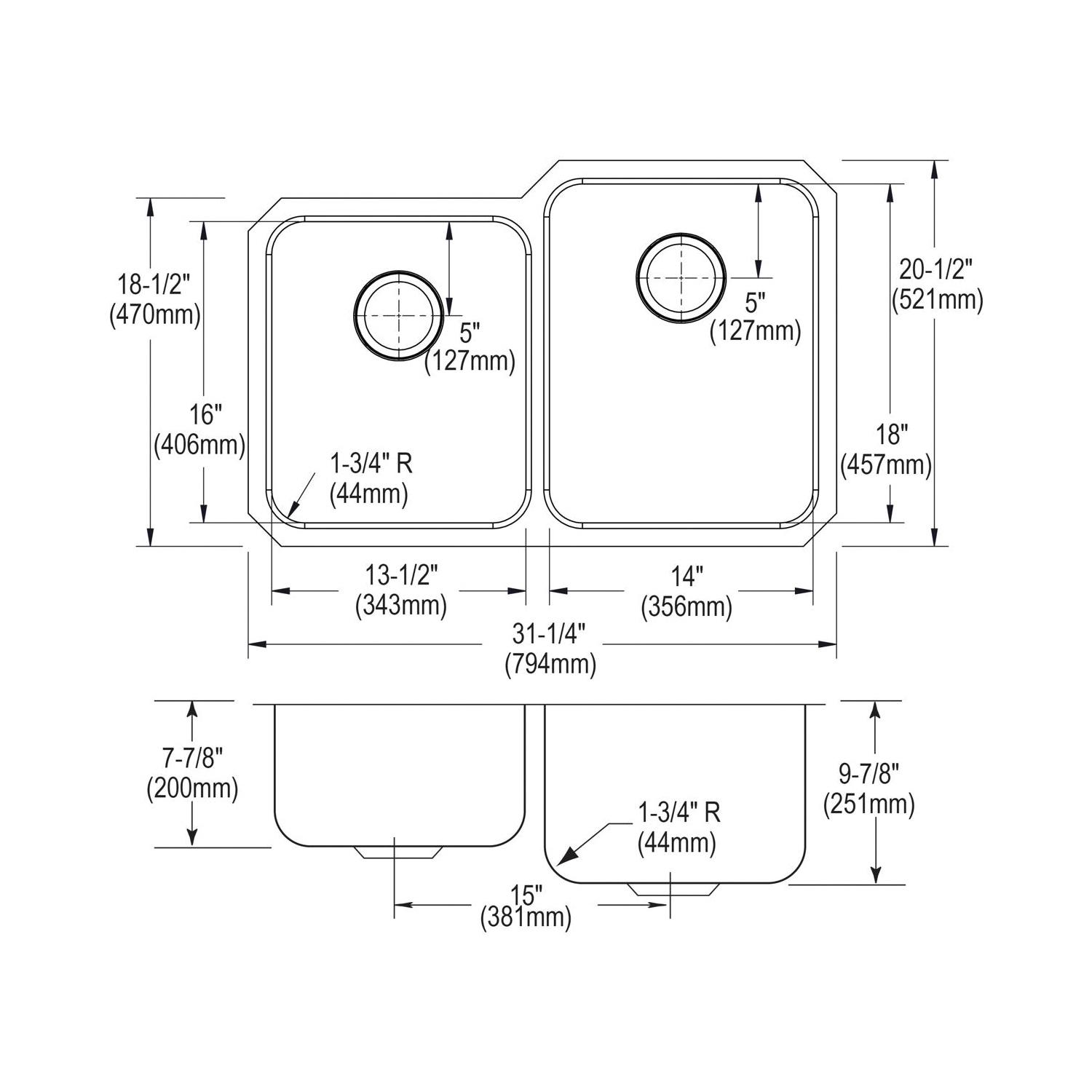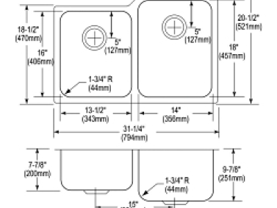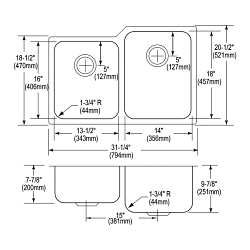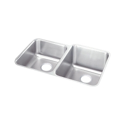 Elkay®, ELUH3120L, Kitchen Sink, Offset, Lustertone™ Classic Collection, Rectangle Shape, 13-1/2 in Left, 14 in Right Bowl Length, 16 in Left, 18 in Right Bowl Width, 7-7/8 in Left, 9-7/8 in Right Bowl Depth, 3-1/2 in Drain Opening, 2 Bowls, 31-1/4 in L x 20-1/2 in W x 9-7/8 in H Overall, Undermount Mounting, 18 ga 304 Stainless Steel, Domestic