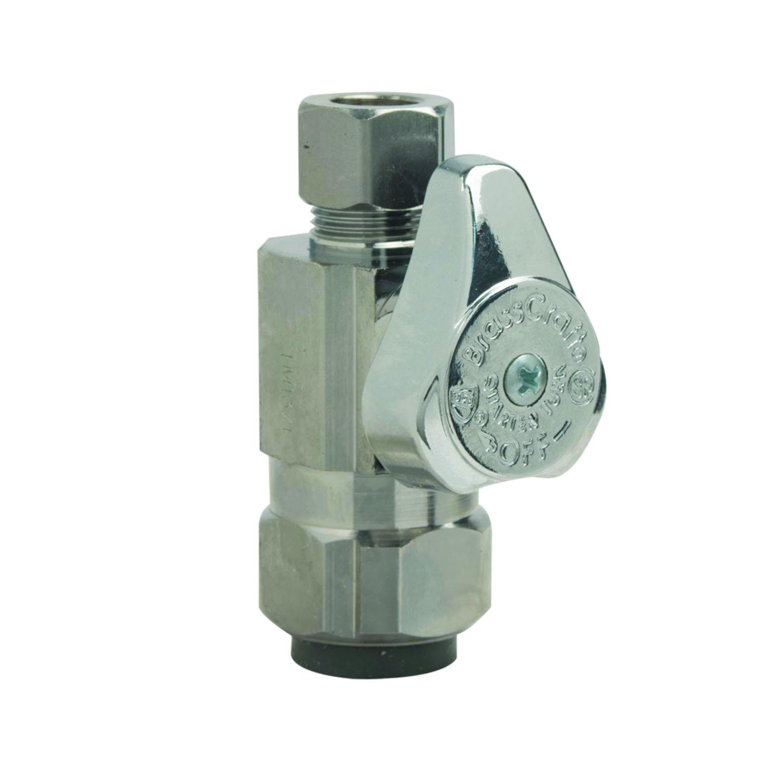 BrassCraft® Straight Stop, 1/4 Turn, Series: G2™, 1/2 x 3/8 in Nominal, Push Connect x OD Compression End Style, 125 psi Pressure, Media: Water, Brass Body, Brass Trim, Santoprene Stem Barrel/EPDM Stem O-Ring Softgoods, 40 to 140 deg F, 1.03 x 2.45 in Dimension, Polished Chrome, Domestic