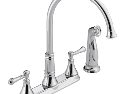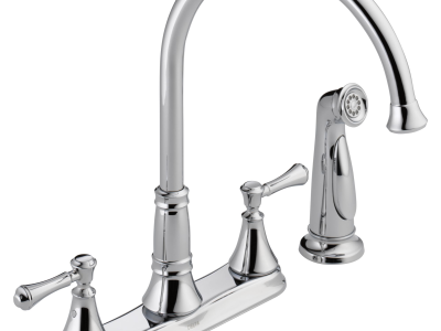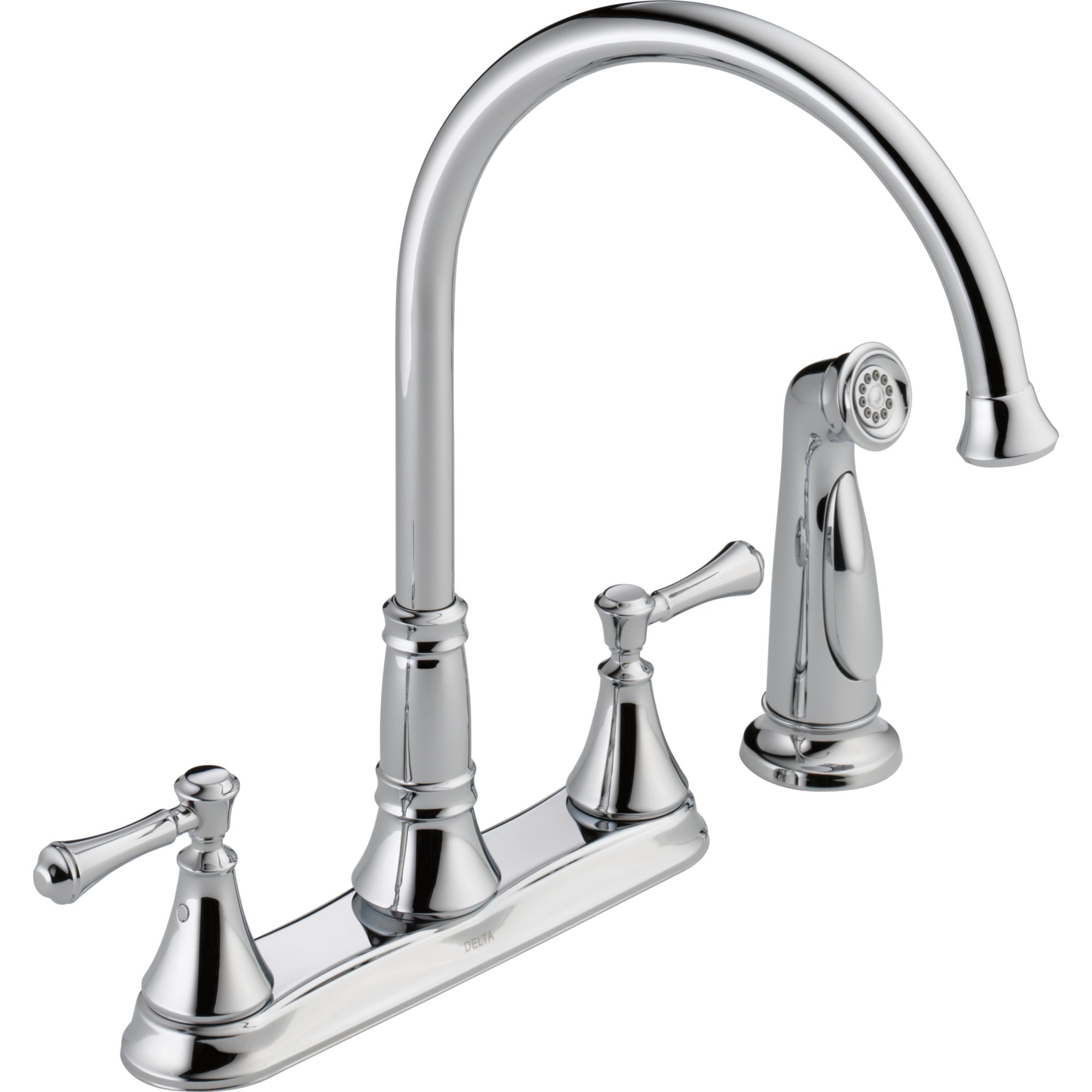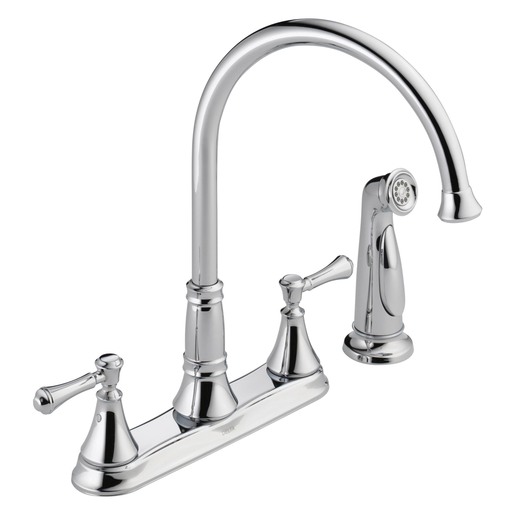 DELTA®, 2497LF, Kitchen Faucet, Cassidy™ Collection, 1.8 gpm Flow Rate, 8 in Center Distance, Swivel Spout, 8-11/32 in Spout Reach, 13-15/16 in Spout Height, Lever Handle, 2 Handles, Side Spray(Y/N): Yes, 4 Faucet Holes, 1-5/16 to 1-1/2 in Faucet Hole, 1/2 in Connection, IPS Connection, 1.84 in Maximum Deck Thickness, Deck Mounting, Euro-Motion DIAMOND™ Seal Valve, Brass, Polished Chrome, Import