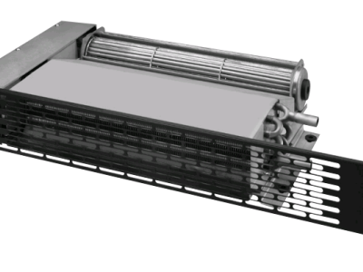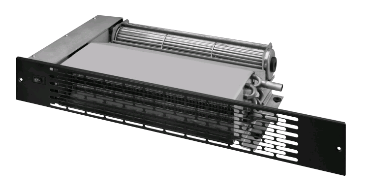 a copper tube, aluminum finned heating element, with an electric motor and blower of unique cross flow design.
