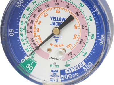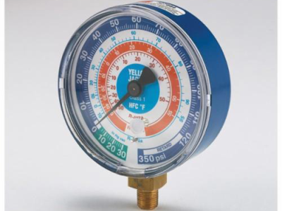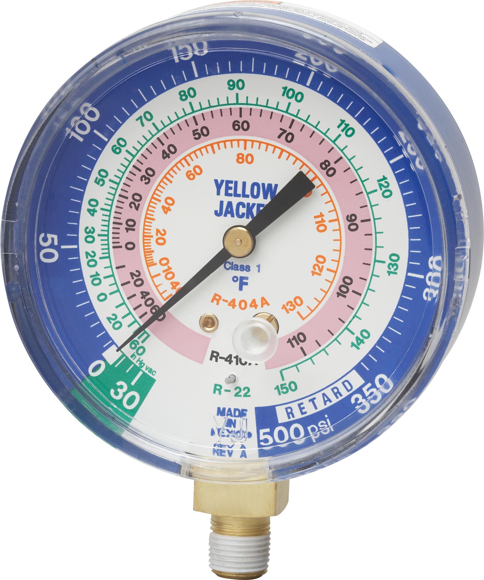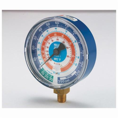 Yellow Jacket® Flutterless™ Manifold Gauge, Dry, 30 in-0-500 psi, 3-1/8 in ga, Brass, Blue, Domestic