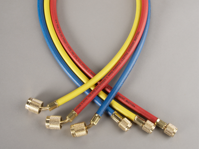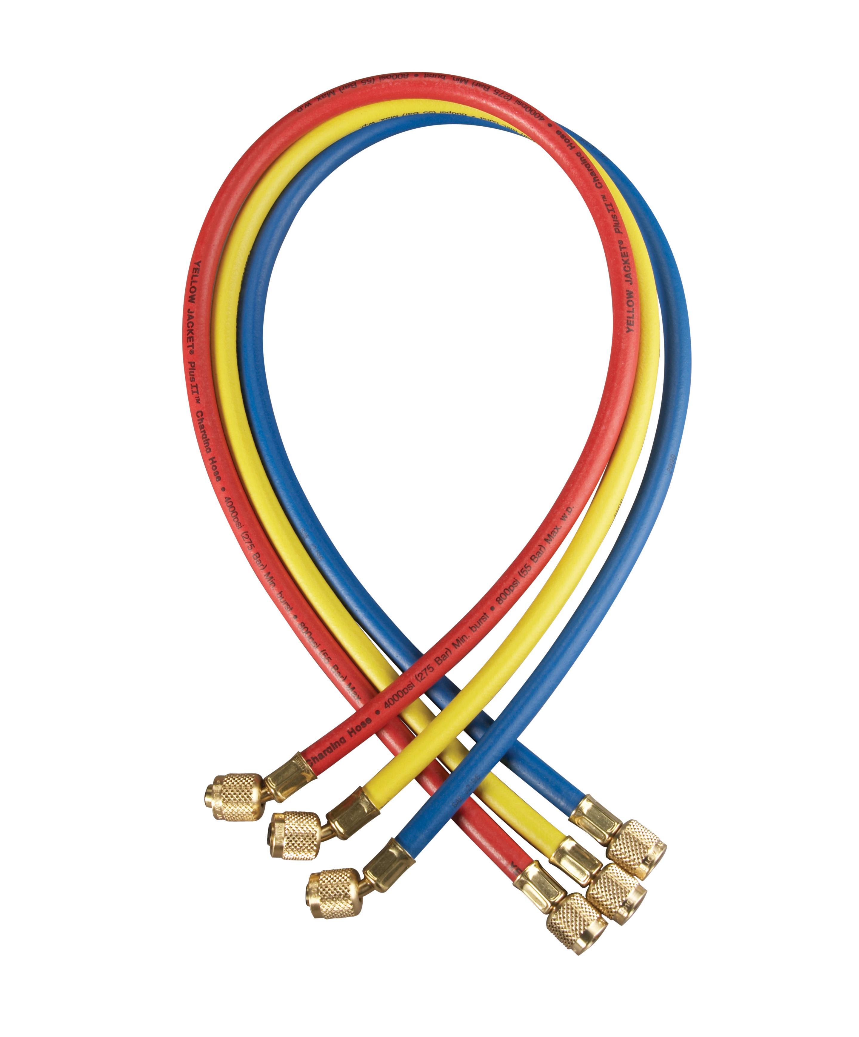 Yellow Jacket® PLUS II™ Hose, 1/4 in Inside Dia, 60 in Length, -20 to 180 deg F, 800 psi Working, 4000 psi Burst, Blue/Red/Yellow, Domestic