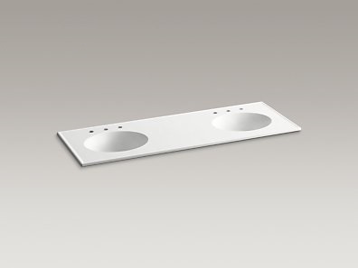 This integrated vanity top and double sink offers a beautifully coordinated and easy design solution to reflect your unique bathroom style. With one-piece, seamless construction to simplify cleaning, Ceramic/Impressions vanity-top sinks are available in an array of dimensional color finishes that evoke a rich, spa-like feeling. This top/sink pairs perfectly with the industry-standard vanity sizes of the KOHLER (R) Tailored vanity collection, and the new dimensional finishes are color matched to existing KOHLER vitreous colors.
