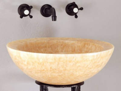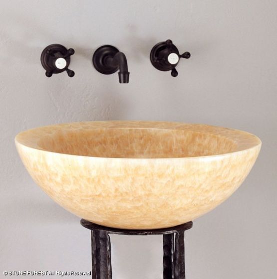 A Stone Forest vessel sink is carved from a single block of natural stone. Each sink will reflect the individual character of the block from which it was carved as well as the inspiration of the craftsman. Made from onyx, a highly variable material, and should be considered one-of-a-kind sink with no two looking exactly the same.