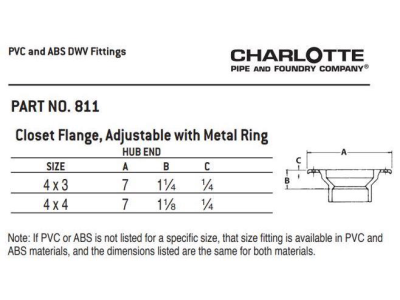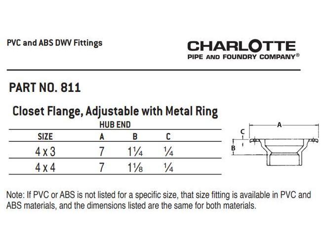 Charlotte ABS 00811 0800 Adjustable DWV Closet Flange With Metal Ring, 4 in ID x 4 in OD, ABS, Domestic