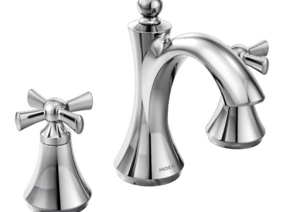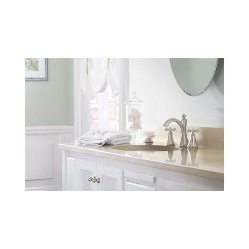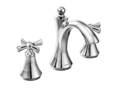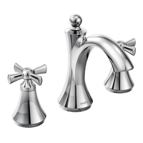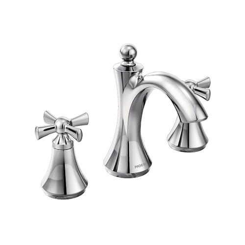 Moen®, T4524, Bathroom Faucet, Wynford™ Collection, 1.2 gpm Flow Rate, 8 to 16 in Center Distance, Fixed Spout, 4-5/8 in Spout Reach, 4-3/8 in Spout Height, Cross Handle, 2 Handles, Pop-Up Drain, 3 Faucet Holes, 1/2 in Connection, IPS Connection, 1-1/4 in Maximum Deck Thickness, Deck Mounting, 1224 Ceramic Disc Cartridge, 7.75 in W x 5.88 in D x 6.5 in H Dimensions, Metal, Chrome, Import