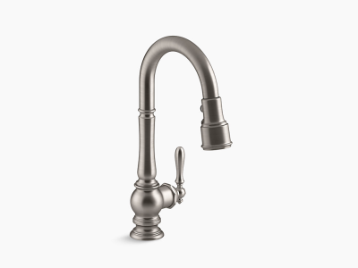 The KOHLER® Artifacts faucet collection brings you classic designs reimagined in fresh ways for various task areas of the kitchen. This Artifacts deck-mount kitchen sink faucet displays vintage style with its high-arch spout and turned lever handle. The three-function pull-down sprayhead has you covered for a range of tasks: BerrySoft spray for food prep; an aerated stream for filling pots; and Sweep spray for cleaning. KOHLER®'s DockNetik docking system secures the sprayhead to the spout.