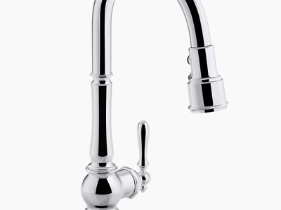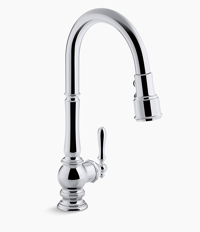 The KOHLER® Artifacts faucet collection brings you classic designs reimagined in fresh ways for various task areas of the kitchen. This Artifacts pull-down deck-mount kitchen sink faucet displays vintage style with its high-arch spout and turned lever handle. The three-function pull-down sprayhead has you covered for a range of tasks: BerrySoft spray for food prep, an aerated stream for filling pots, and Sweep spray for cleaning. Kohler's DockNetik docking system secures the sprayhead to the spout.