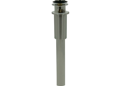 Dome style, soft touch lavatory drain for sinks and vessels with overflow. Fully plated brass drain body and tailpiece. Features EZ-Click(TM) round dome pop-up drain mechanism.