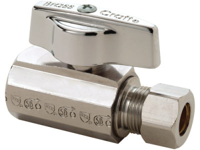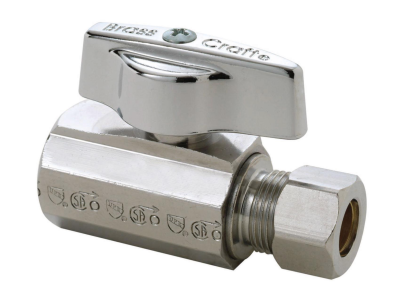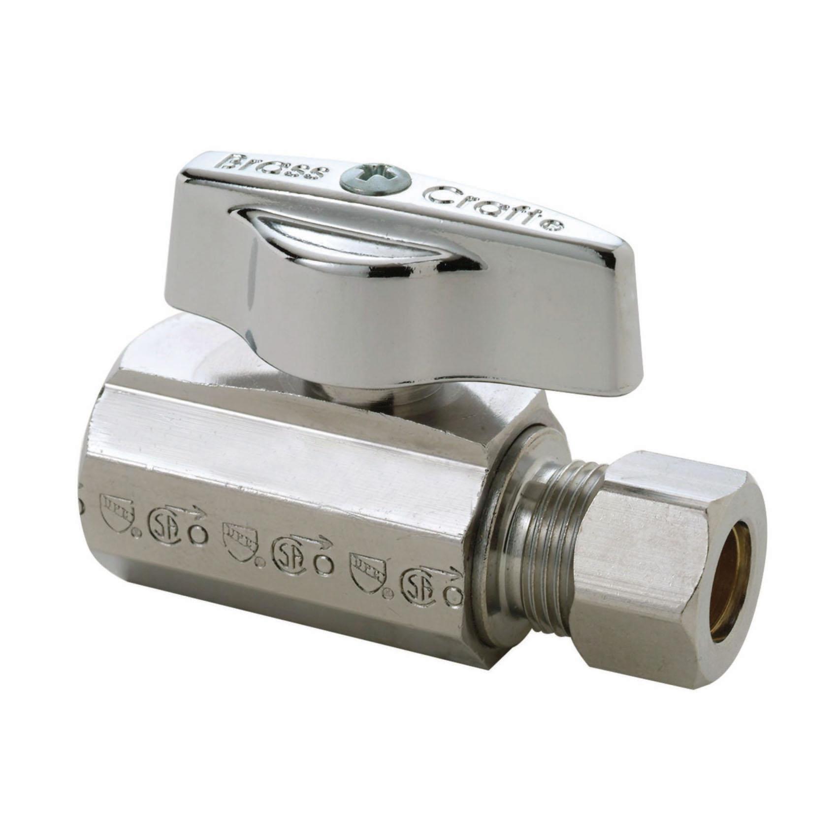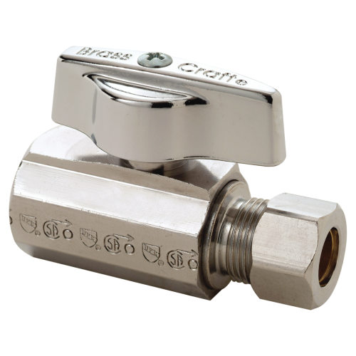 BrassCraft® Straight Ball Stop, 1/4 Turn, Series: KT™, 3/8 in Nominal, FNPT x Compression End Style, 125 psi Pressure, Media: Water, Brass Body, Brass Trim, Rubber O-Ring Softgoods, 40 to 180 deg F, Polished Chrome, Domestic
